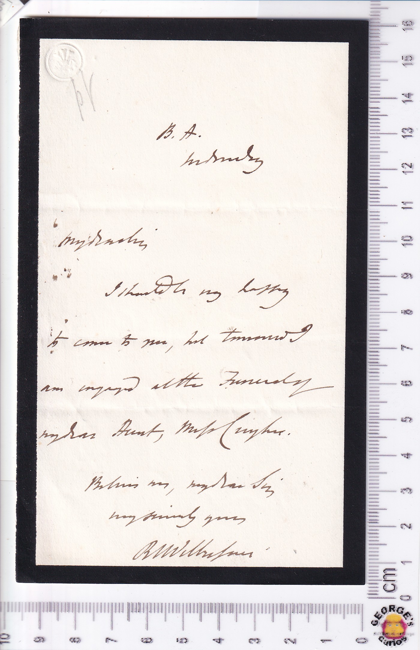 The letter references his Aunt’s funeral. She would be Mary (Spooner) Hughes (1770 – 1847), elder sister of Wilberforce’s mother, Barbara Ann Spooner.